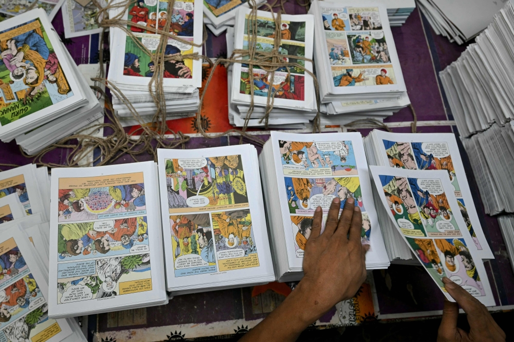 A worker arranging pages for binding at Amar Chitra Katha's printing press in Mumbai. (Photo by Indranil Mukherjee / AFP)