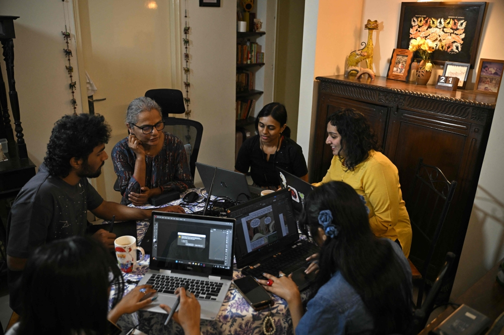 This photograph taken on January 21, 2026 shows Reena Puri, executive editor of India's oldest and indigenous comic book publisher Amar Chitra Katha, working with the design team at her residence in Bengaluru. (Photo by Idrees Mohammed / AFP)