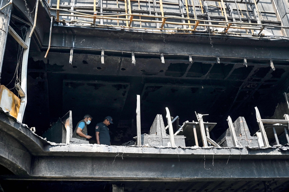 Firefighters and forensic expert inspect a commercial building, a day after a fire accident in Dhaka on March 1, 2024. Photo by Munir UZ ZAMAN / AFP
