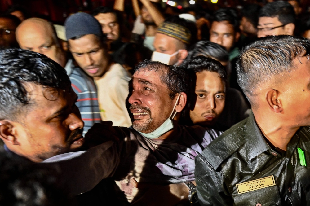 A member of the public reacts as firefighters carry out rescue operations following a fire in a commercial building that killed at least 43 people, in Dhaka, on February 29, 2024. Photo by Munir Uz Zaman / AFP