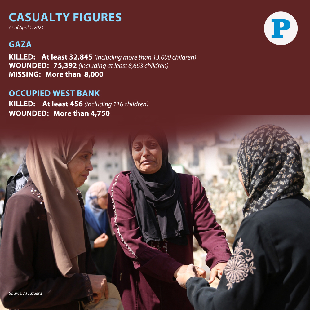 Gaza: The Ministry of Health in Gaza announced on Monday that the death toll from the ongoing Israeli aggression on the Gaza Strip since October 7 has risen to 32,845 martyrs and 75,392 wounded, while thousands are still missing under the rubble and on the roads as occupation forces prevent ambulance teams from reaching them.