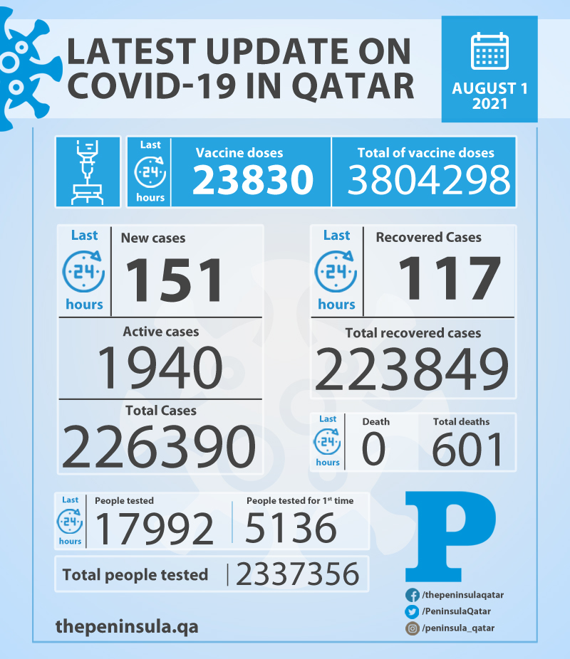 The total number of positive Covid-19 cases recorded in Qatar till now is 226,390 and there are 1,940 active cases under treatment.