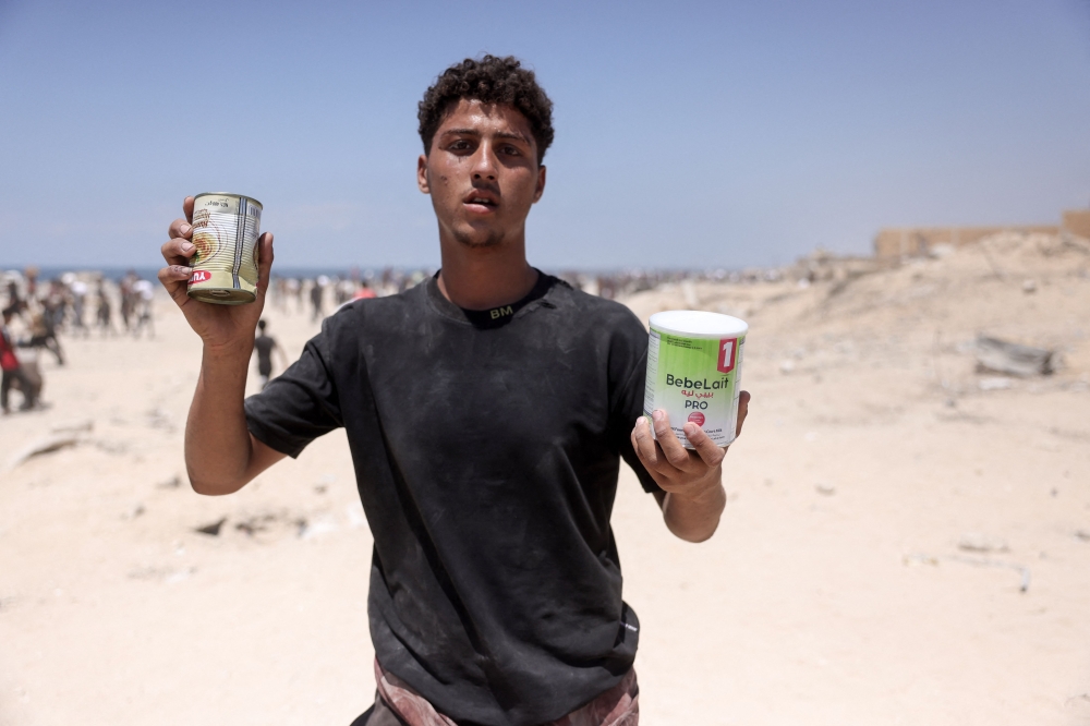 A Palestinian youth carries a can of food in one hand and a box of baby formula in the other, as he returns from an area in which aid trucks entered Gaza through the Zikim crossing point, in Jabalia in the northern Gaza Strip on August 1, 2025. (Photo by Bashar Taleb / AFP)