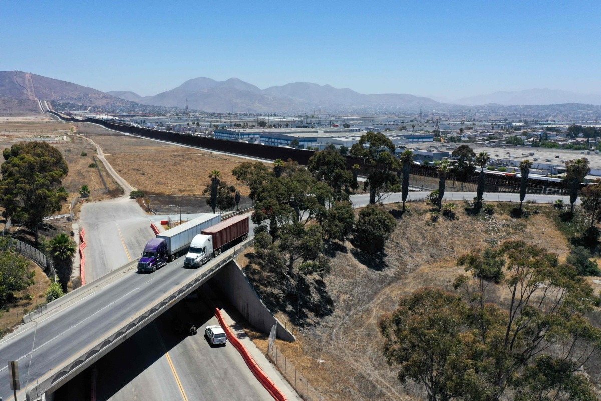 This aerial image shows a section of border wall as trucks drive into a California Highway Patrol (CHP) inspection station after entering the US from Mexico, crossing the border at the US Customs and Border Protection (CBP) Otay Mesa Land Port of Entry, in Otay Mesa, California on July 31, 2025. Photo by Patrick T. Fallon / AFP