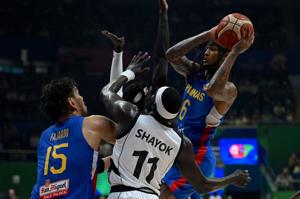 Philippines’ Jordan Clarkson (r) holds the ball during the FIBA basketball World Cup classification match 17-32 group M between Philippines and South Sudan at Smart Araneta Coliseum in Quezon City, Metro Manila on August 31, 2023. (Photo by Jam Sta Rosa / AFP)