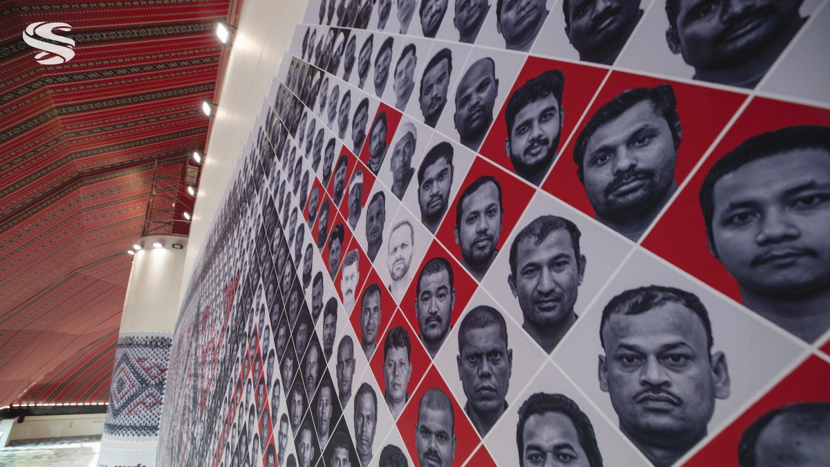 The mural is located in two areas inside the stadium, first one at the entrance for the players and the second mural on the upper floors that can be seen from the stands. Below the mural, which has photos of all the workers, there is a banner that has thank you written in different languages of the workers.