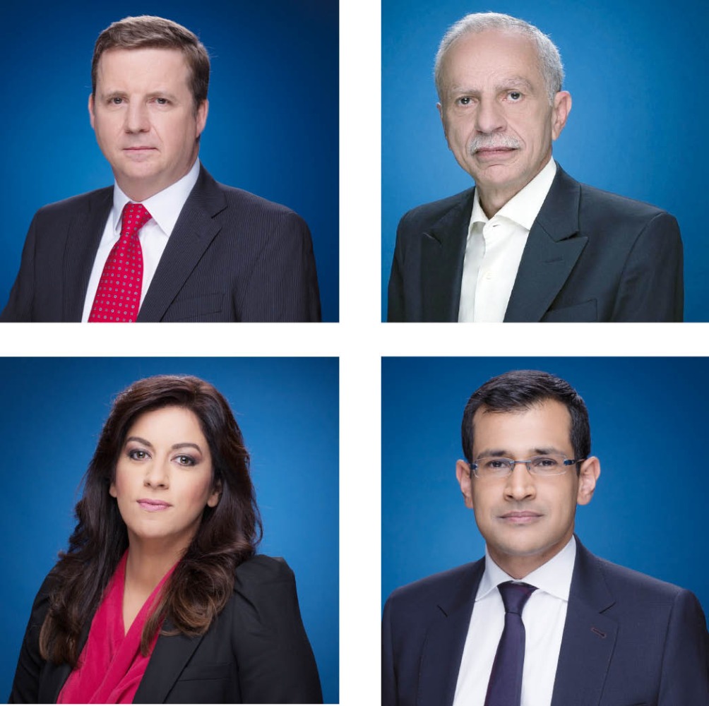 Clockwise from top left: Giles Trendle, Managing Director; Salah Negm, Director of News; Kamahl Santamaria, Principal Presenter; and Renee Odeh, Manager of Output of Al Jazeera English Channel.