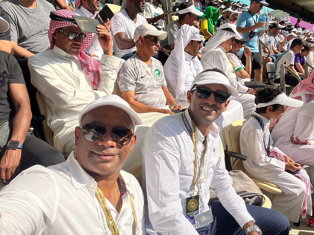 Former Sri Lankan cricketers Sanath Jayasuriya and Farveez Maharoof in the stands during Argentina vs Saudi Arabia match at Lusail Stadium on November 22.