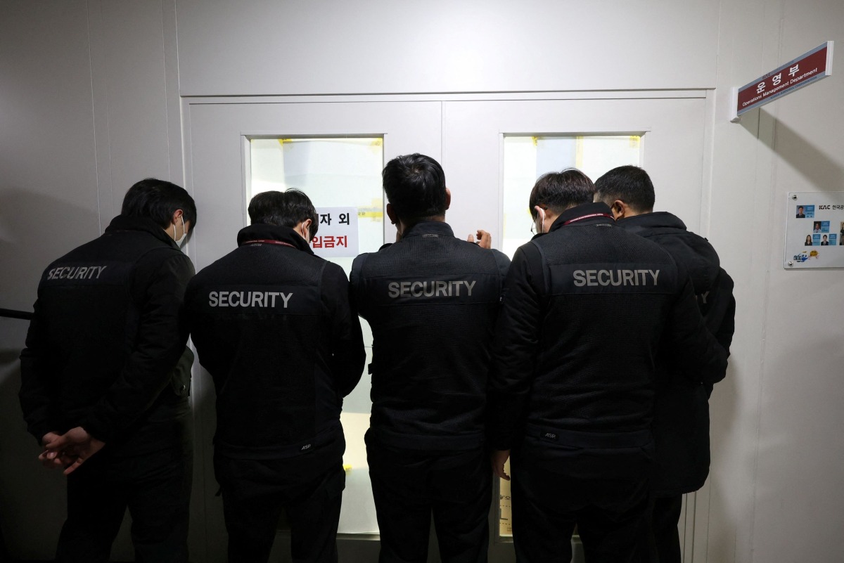 Airport security staff block the front door of the operations department during a police raid at Muan International Airport in Muan, some 288 kilometres southwest of Seoul on January 2, 2025. Photo by YONHAP / AFP