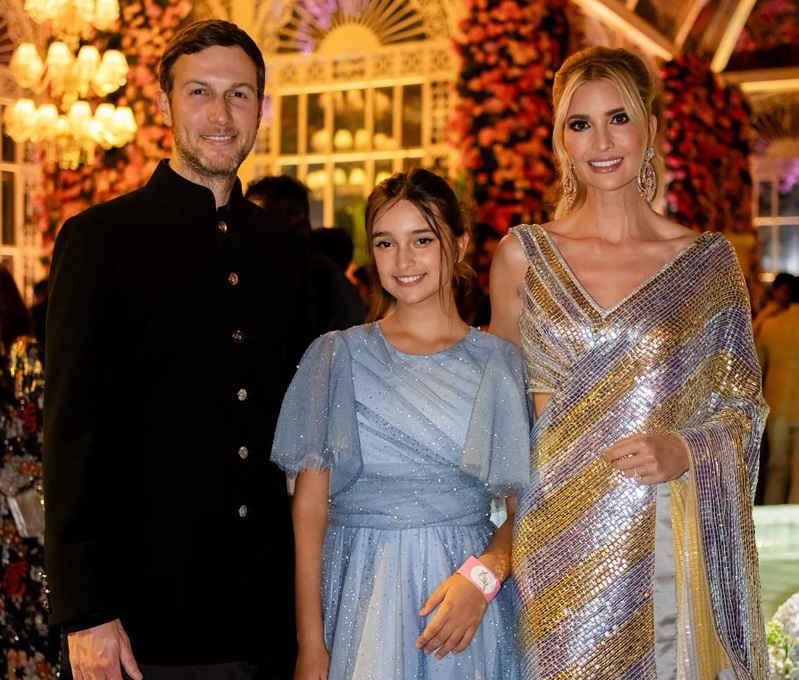 This handout photograph taken and released by Reliance on March 1, 2024, shows Ivanka Trump (R), daughter of US' former president Donald Trump with husband Jared Kushner (L), a White House adviser under Trump in Jamnagar. (Photo by Reliance / AFP)