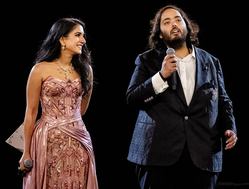 Photograph taken and released by Reliance on March 1, 2024, shows Anant Ambani (R), son of billionaire tycoon Mukesh Ambani, with his fiancée Radhika Merchant addressing guests. (Photo by Reliance / AFP)