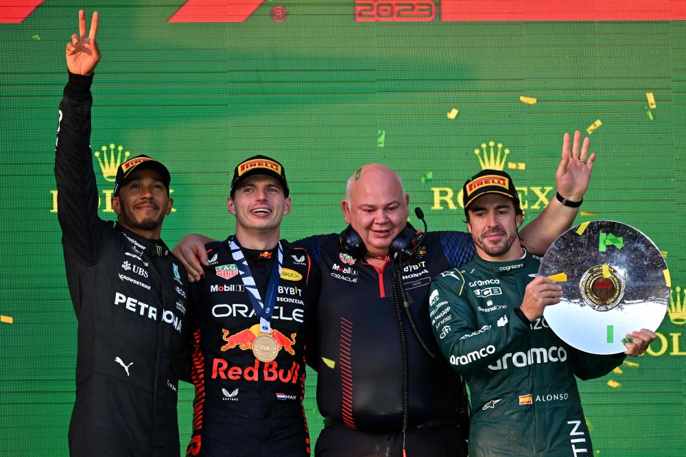 Red Bull Racing's Dutch driver Max Verstappen (2nd L) celebrates victory with the trophy next to second-placed Mercedes' British driver Lewis Hamilton and third-placed Aston Martin's Spanish driver Fernando Alonso (R) on the podium after the 2023 Formula One Australian Grand Prix at the Albert Park Circuit in Melbourne on April 2, 2023. Photo by Paul CROCK / AFP