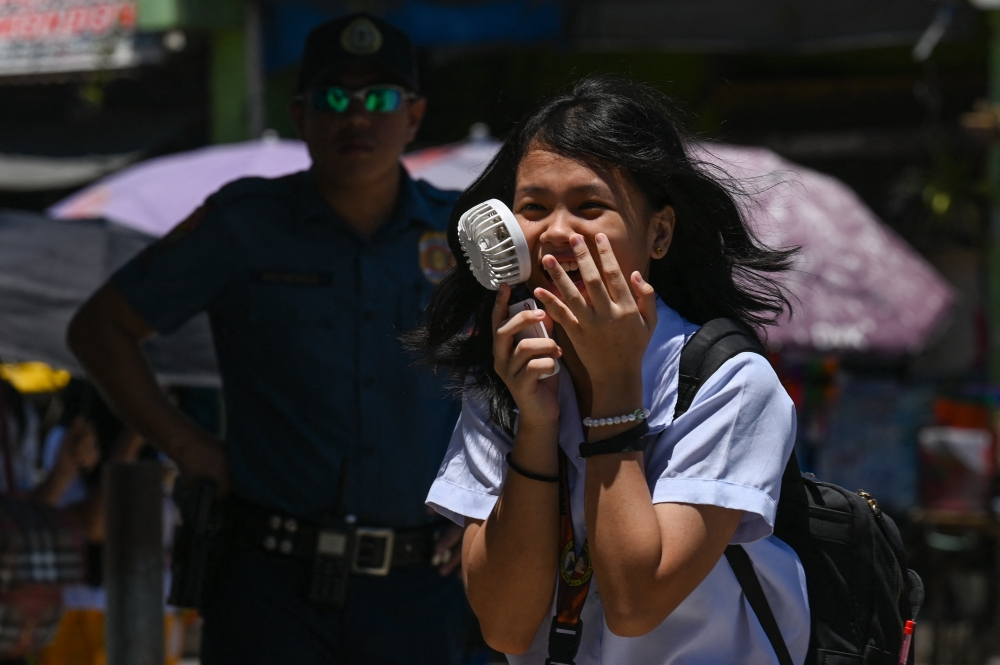 Student uses a portable fan outside a school in Manila on April 2, 2024. (Photo by Jam Sta Rosa / AFP)