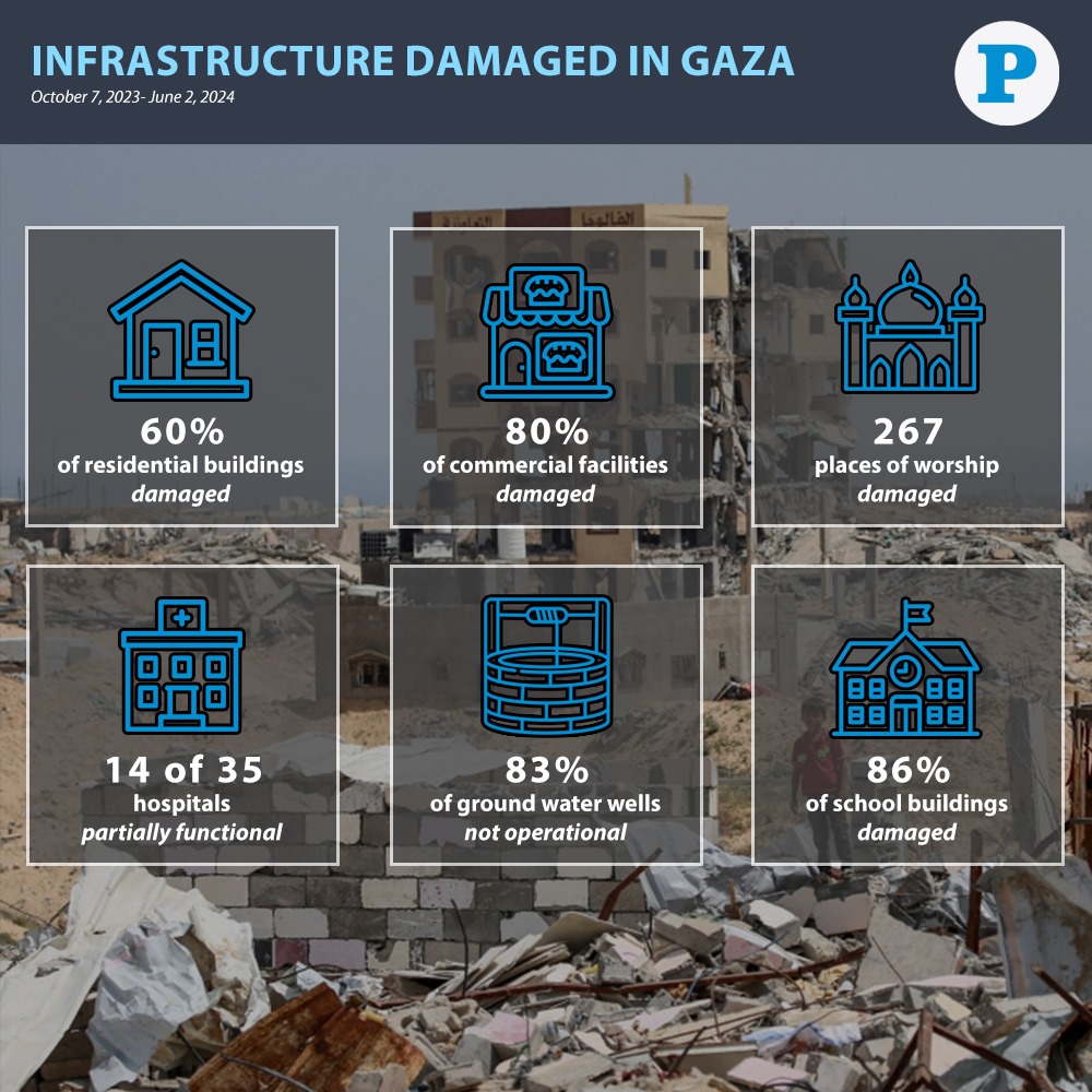 According to the latest data from the UN’s Office for the Coordination of Humanitarian Affairs, the World Health Organization and the Palestinian government as of June 2, Israeli attacks have damaged: