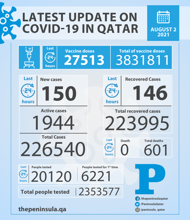 Doha: Ministry of Public Health (MoPH) today reported 150 new cases of coronavirus (Covid-19) and 146 people recovered from the virus in the last 24 hours, bringing the total number of people recovered in Qatar to 223,995.