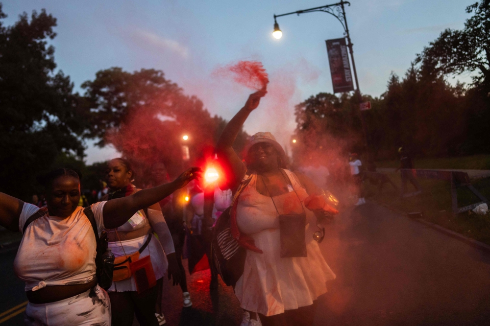 People throw powder as they take part in the annual street party J'ouvert on September 2, 2024 in New York City. J'ouvert marks the start of Carnival in many Caribbean countries; the name comes from the French phrase jour ouvert, which means "daybreak" or "morning" and originated from celebrations commemorating the end of slavery. (Photo by Adam Gray / GETTY IMAGES NORTH AMERICA / Getty Images via AFP)
