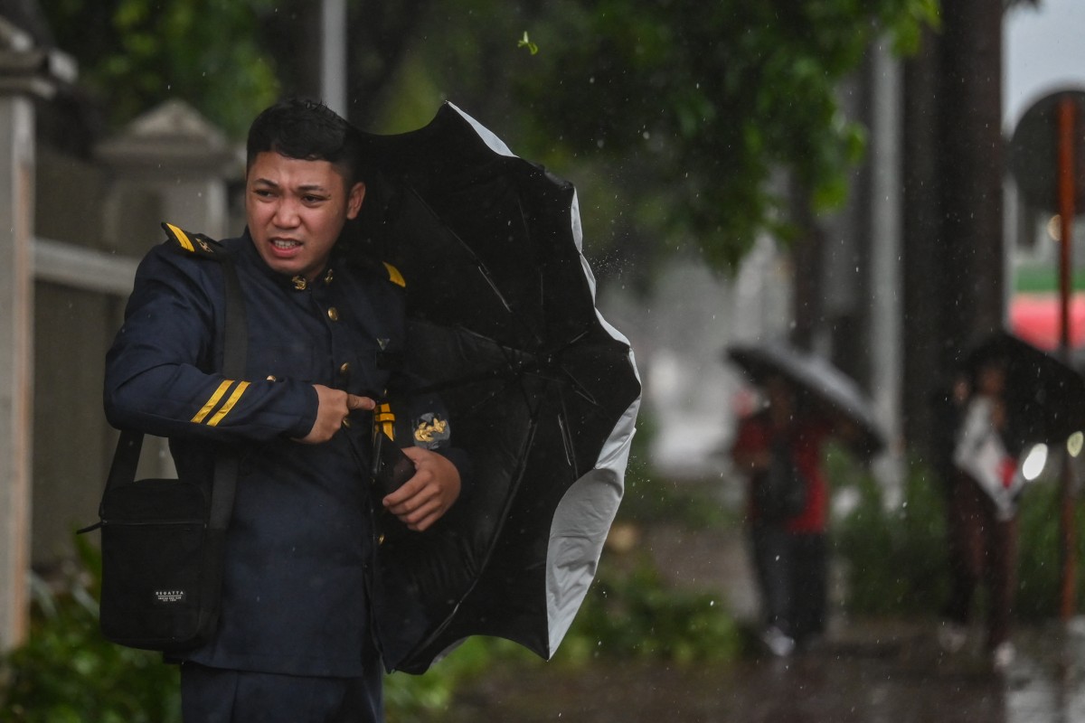 A pedestrian holds on to her umbrella amid heavy rains and wind brought by Tropical Storm Yagi in Manila on September 2, 2024. Photo by Ted ALJIBE / AFP
