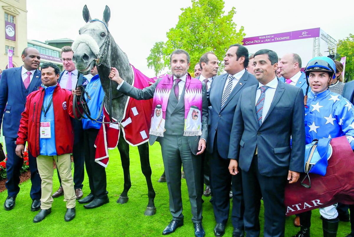 H E Sheikh Mohamed bin Khalifa Al Thani poses for a photograph with Gazwan and the members of the winning team at Chantilly Racecourse in France yesterday.