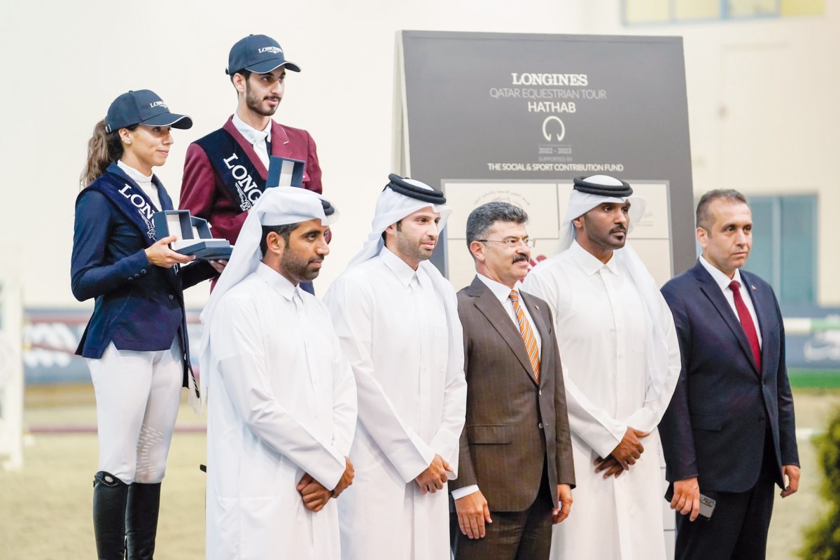 The podium winners of the Big Tour competition in Round 3 of the Longines Hathab Qatar Equestrian Tour 2022, Mohammed Khalifa Albaker and Cyrine Cherif pose for a photograph with officials.