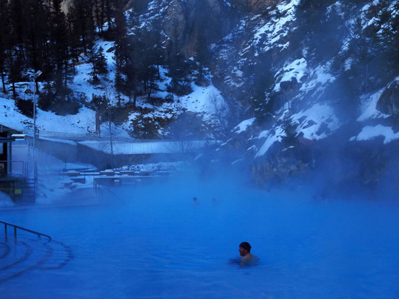 The mineral-rich waters of Radium Hot Springs, in Kootenay National Park, British Columbia, are fed by rain that filters more than a mile underground before being geothermally heated and forced back up as steam. The Washington Post / John Briley