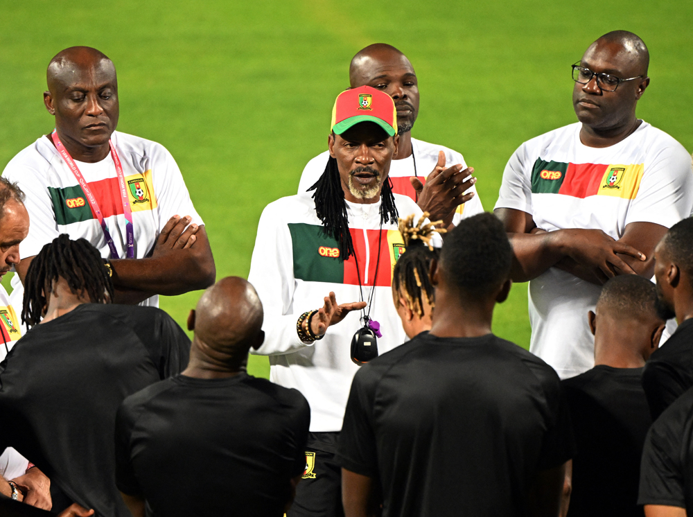 Cameroon coach Rigobert Song speaks to the players. REUTERS