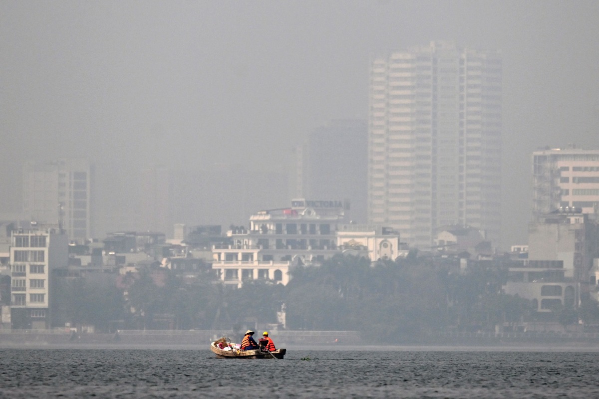 Workers sit in a boat on West Lake amid heavy air pollution conditions in Hanoi on January 3, 2025. Photo by Nhac NGUYEN / AFP