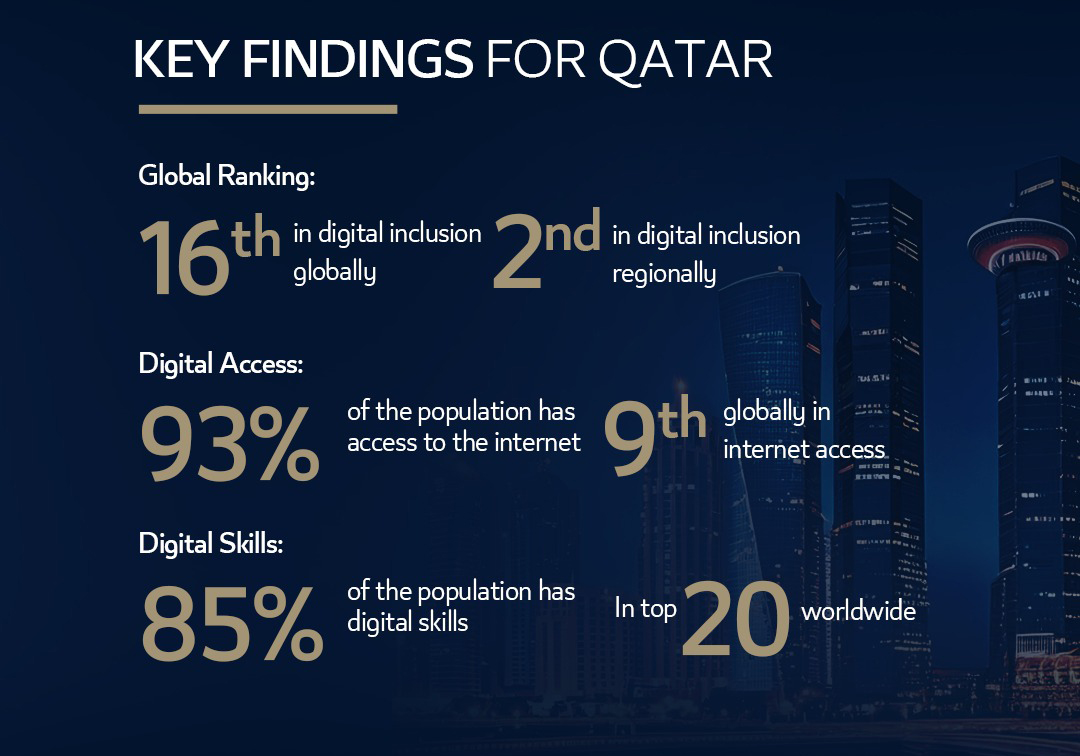 The report highlights the notable achievements that have positioned Qatar as second regionally and 16th globally in digital inclusion. Meanwhile, 93% of population has access to the Internet as the country ranks 9th globally in Internet access and also 85% of population has digital skills.