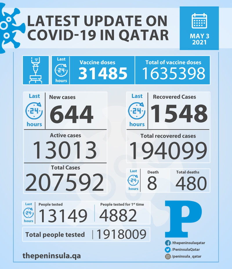 The total number of positive Covid-19 cases recorded in Qatar is 207,592 and there are 13,013 active cases under treatment.