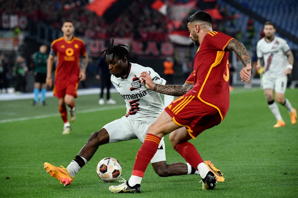 Roma's Italian defender #37 Leonardo Spinazzola fights for the ball with Bayer Leverkusen's Dutch defender #30 Jeremie Frimpong (L) during the UEFA Europa League semi final first leg football match between AS Roma and Bayer Leverkusen at the Olympic stadium on May 2, 2024 in Rome. (Photo by Filippo MONTEFORTE / AFP)