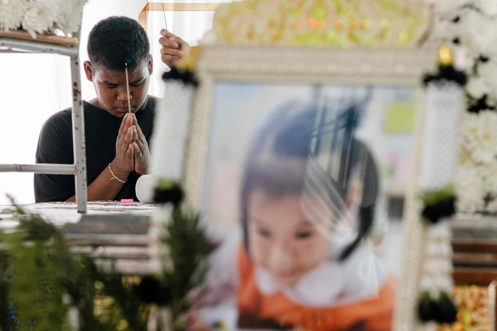 A boy holds an incense stick as he prays for victims of a school bus fire near their coffins at Wat Khao Phraya Sangkharam School in Uthai Thani on October 3, 2024. Photo by Chanakarn Laosarakham / AFP