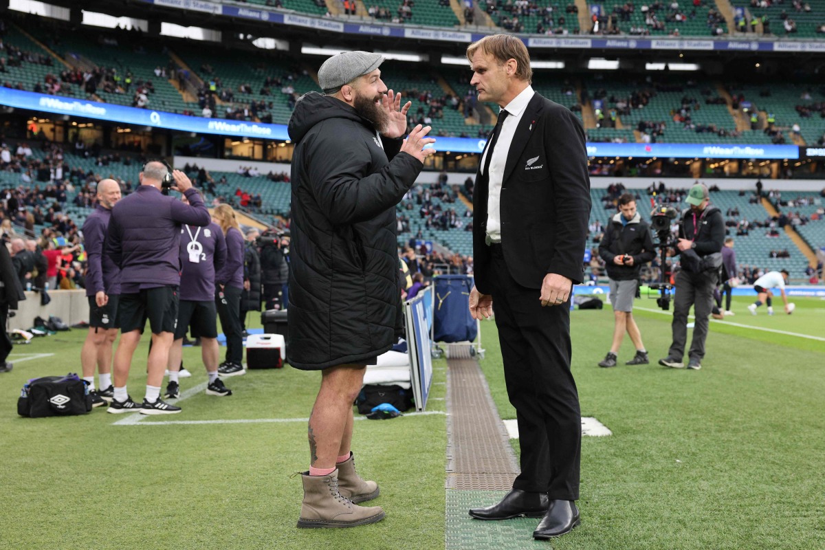 England's Joe Marler (L) speaks with New Zealand's head coach Scott Robertson (R) beside the pitch ahead of the Autumn Nations Series International rugby union test match between England and New Zealand at the Allianz Stadium, Twickenham in south-west London, on November 2, 2024. (Photo by Adrian DENNIS / AFP)