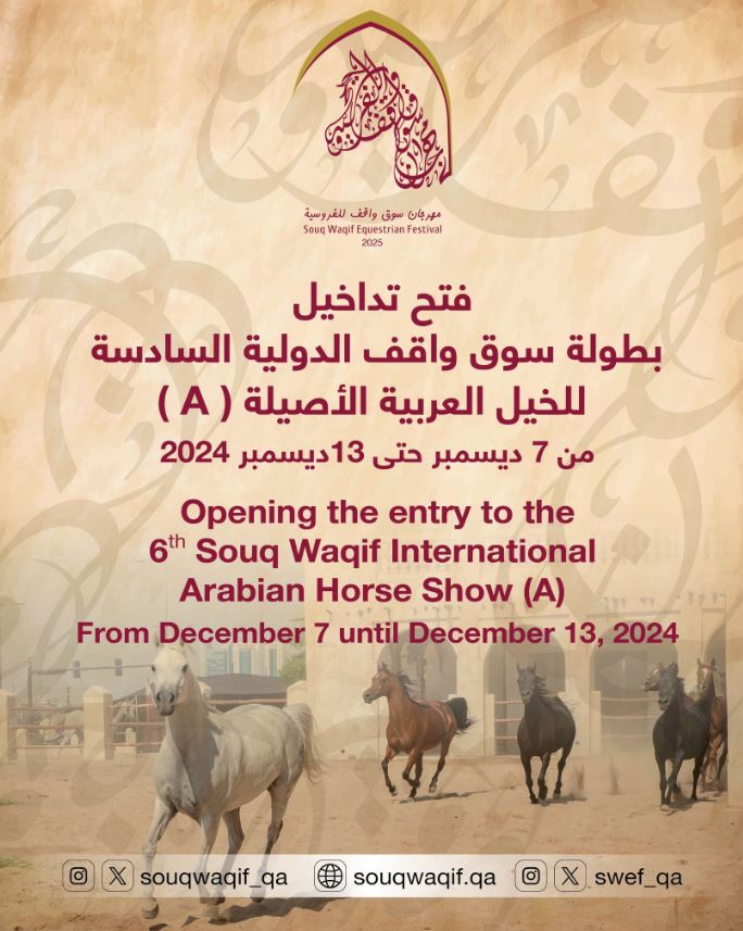 The Organizing Committee of the Souq Waqif Equestrian Festival has also announced the opening of registrations for the 6th Souq Waqif International Championship for Purebred Arabian Horses (Category A).