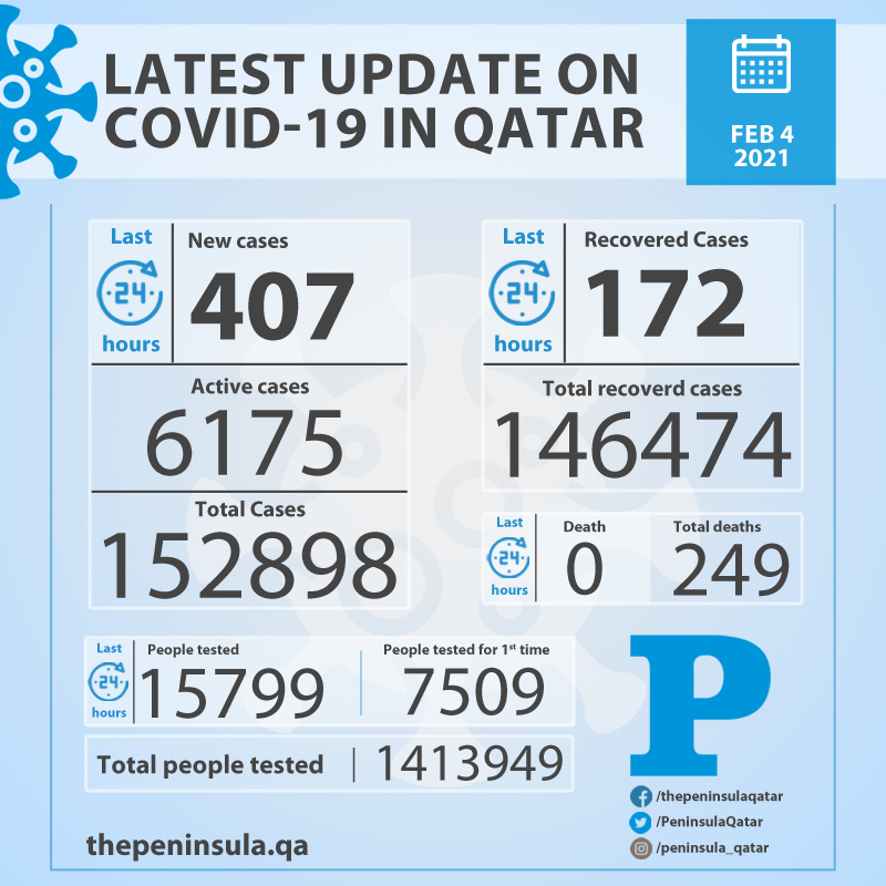 Doha: Ministry of Public Health (MoPH) today reported 407 new cases of coronavirus (Covid-19) and 172 people recovered from the virus in the last 24 hours, bringing the total number of people recovered in Qatar to 146,474.