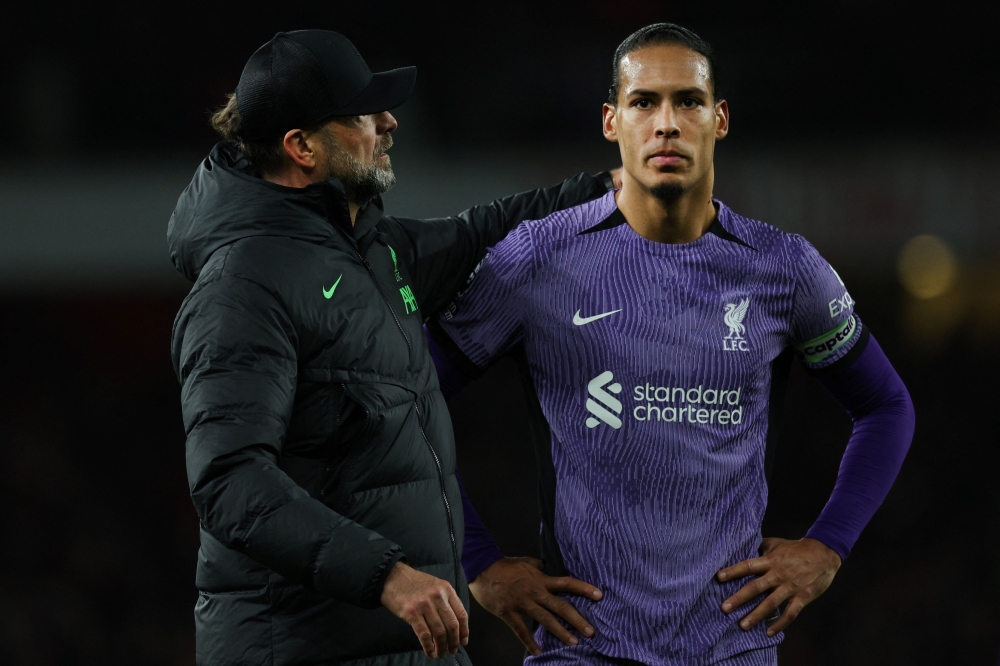 Liverpool's German manager Jurgen Klopp (L) comforts Liverpool's Dutch defender #04 Virgil van Dijk at the end of the English Premier League football match between Arsenal and Liverpool at the Emirates Stadium in London on February 4, 2024. (Photo by Adrian DENNIS / AFP)