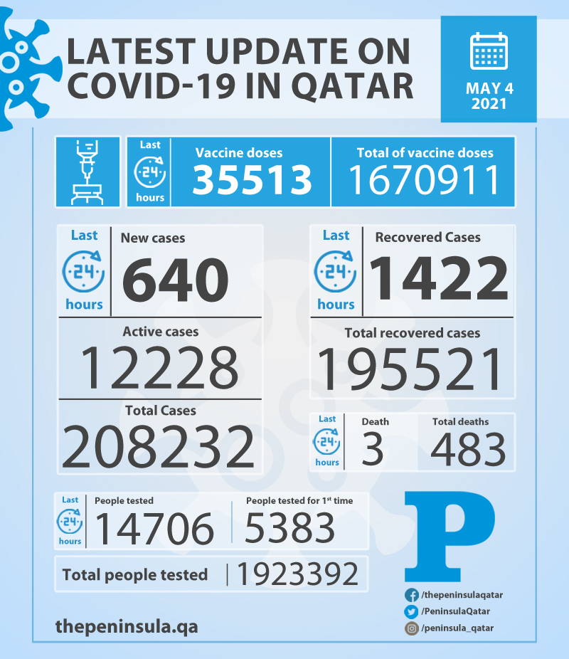 Doha: Ministry of Public Health (MoPH) today reported 640 new cases of coronavirus (Covid-19) and 1,422 people recovered from the virus in the last 24 hours, bringing the total number of people recovered in Qatar to 195,521.