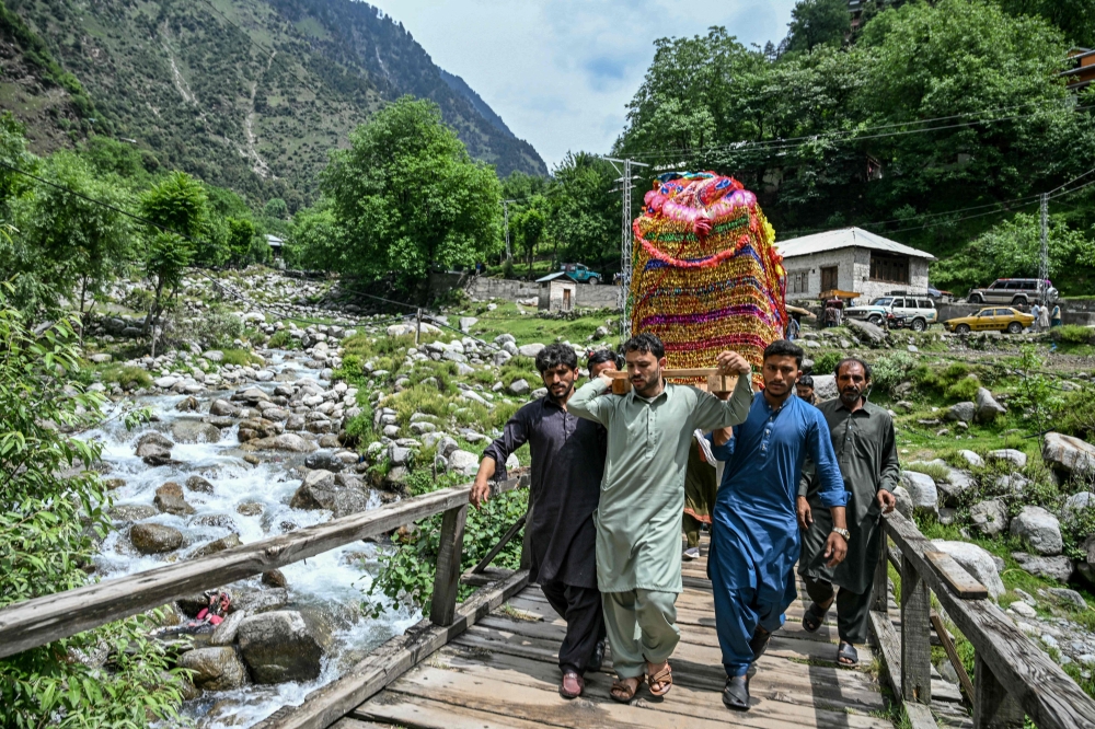 Relatives carry the bride, Rabia Bibi, in a Doli, a traditional hand cart used to carry brides at weddings, as they leave for the groom's house in Ashkot village on the Line of Control (LoC) in Neelum Valley, Kashmir, on May 3, 2025. (Photo by Farooq Naeem / AFP)