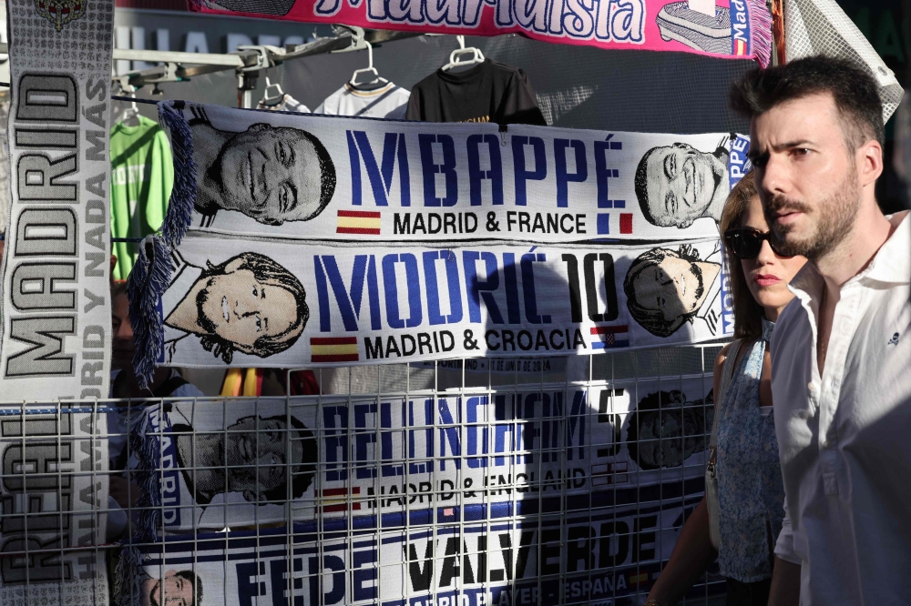 Football scarves of French footballer Kylian Mbappe , Croatian player Luka Modric and Briton Jude Bellingan are displayed at a street vendor stand outside the Santiago Bernabeu stadium in Madrid prior to the celebration in London of the UEFA Champions League final football match between Borussia Dortmund and Real Madrid, on June 1, 2024. Photo by Thomas COEX / AFP