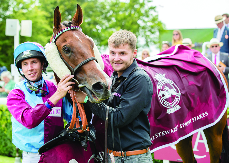 Jockey James Sullivan (left) celebrates with Poyle Vinnie after winning the £75,000 Qatar Stewards’ Sprint Handicap, yesterday.