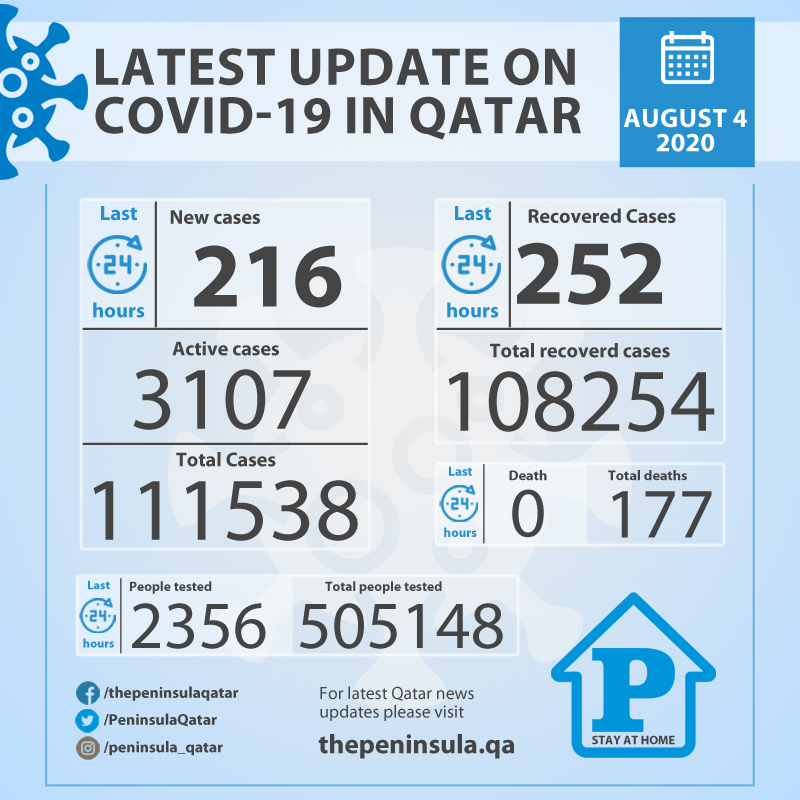 216 Covid-19 cases and 252 recoveries in Qatar on Aug 4