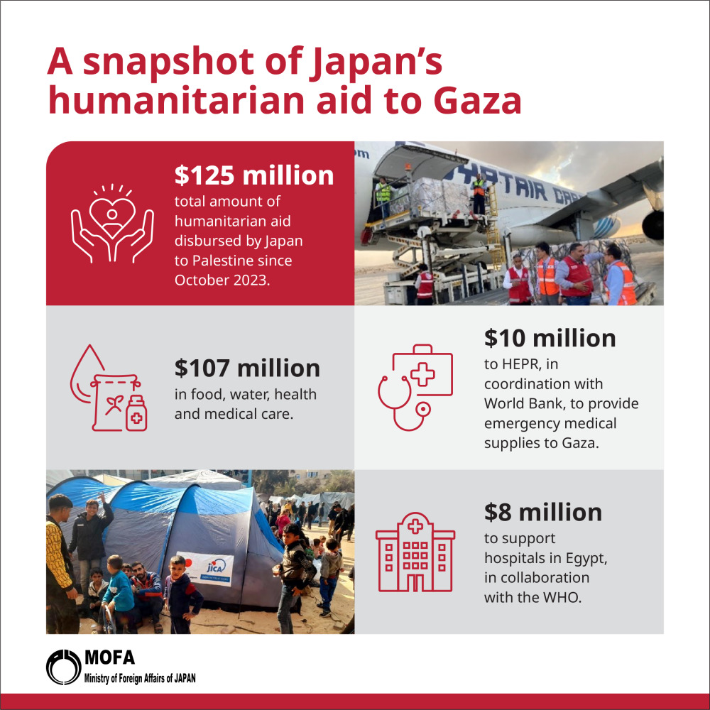 “It is also necessary to address medium-to-long-term issues such as reforming the Palestinian Authority (PA), promoting the political process toward a two-state solution, and reconstructing Gaza. Japan is already providing much-needed humanitarian aid and relief for the Palestinian people, including those in the Gaza Strip. Since October 2023, we have provided $125m worth of aid to Gaza.”