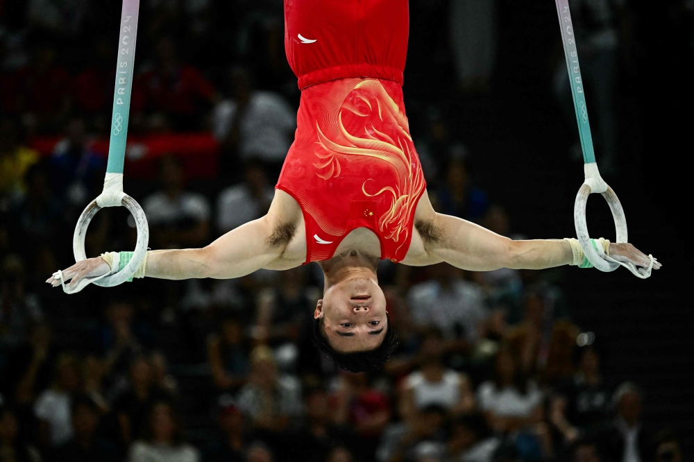 China's Liu Yang competes in the artistic gymnastics men's rings final during the Paris 2024 Olympic Games at the Bercy Arena in Paris, on August 4, 2024. (Photo by Loic VENANCE / AFP)