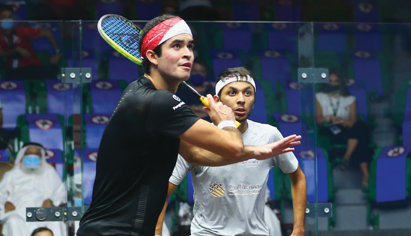 World No.1 Ali Farag (foreground) in action against England’s Richie Fallows during their second round match, yesterday.