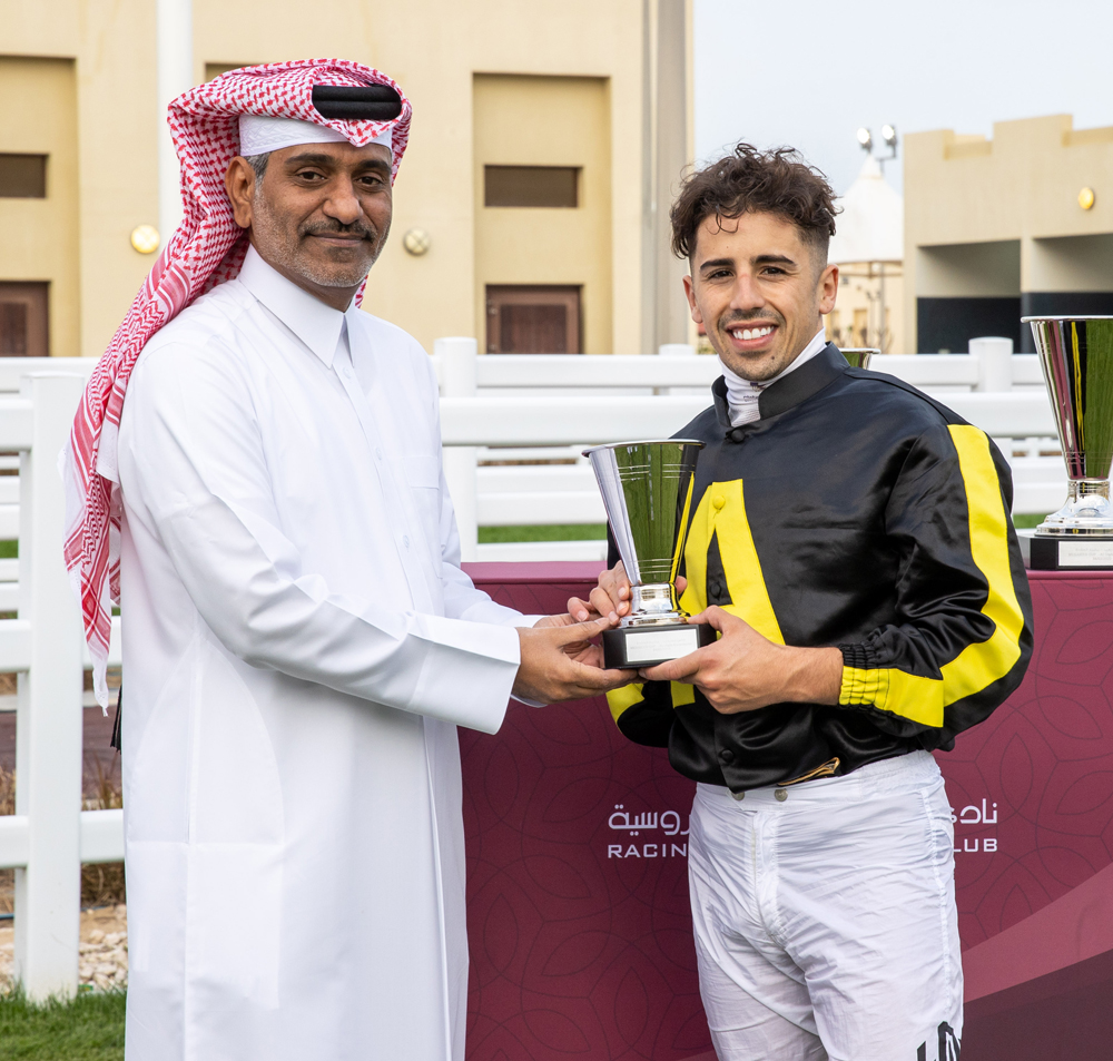 Al Uqda Complex Manager Abdulaziz Jassim Al Boenain presents the winner's trophy to jockey Soufiane Saadi.