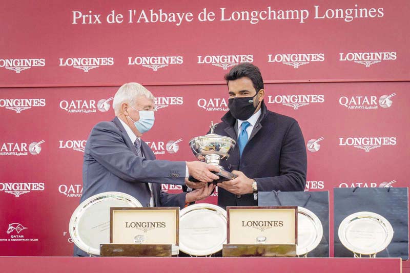 H E Sheikh Joaan bin Hamad bin Khalifa Al Thani presenting the Qatar Prix De l’Arc De Triomphe winner's trophy to the presentative of Sottsass, the new thoroughbred World Champion.