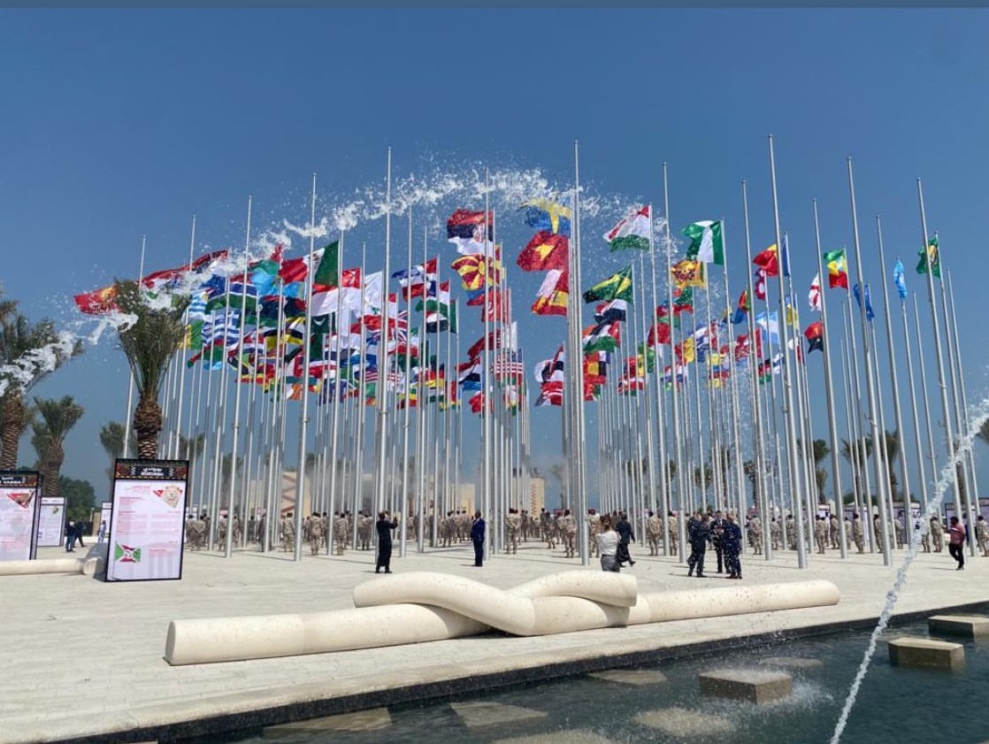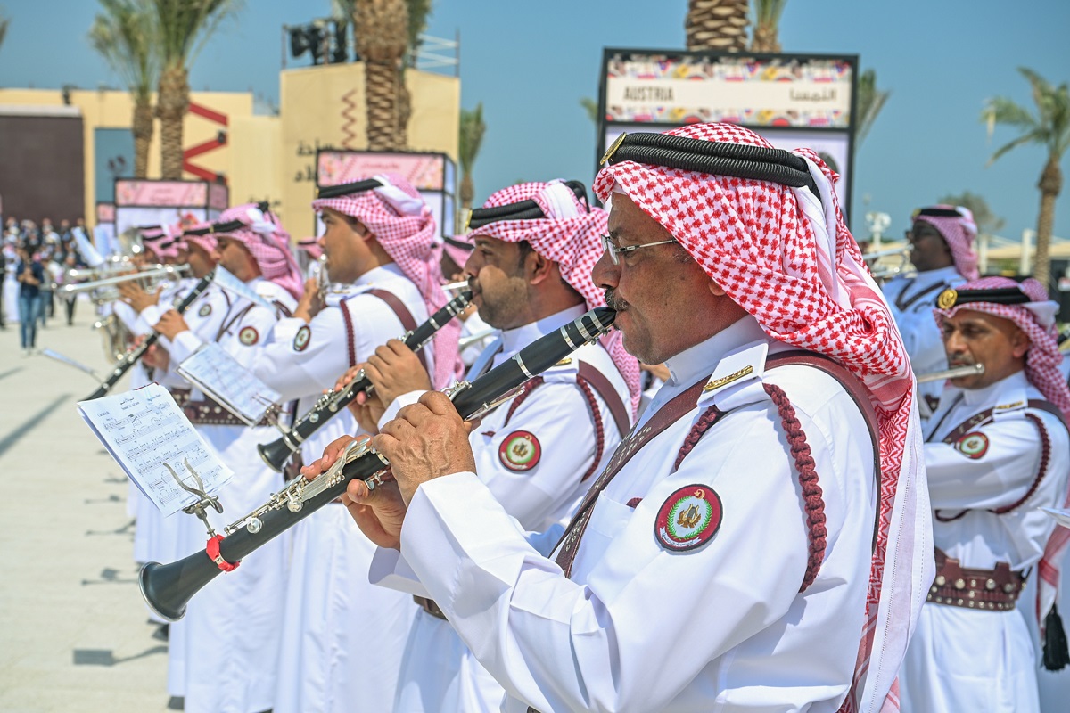 A Qatar Armed Forces band performed at the inauguration ceremony, which was followed by the raising of 119 flags representing nations with diplomatic missions accredited by the state, as well as the flags of the European Union, the United Nations, and the Gulf Cooperation Council.