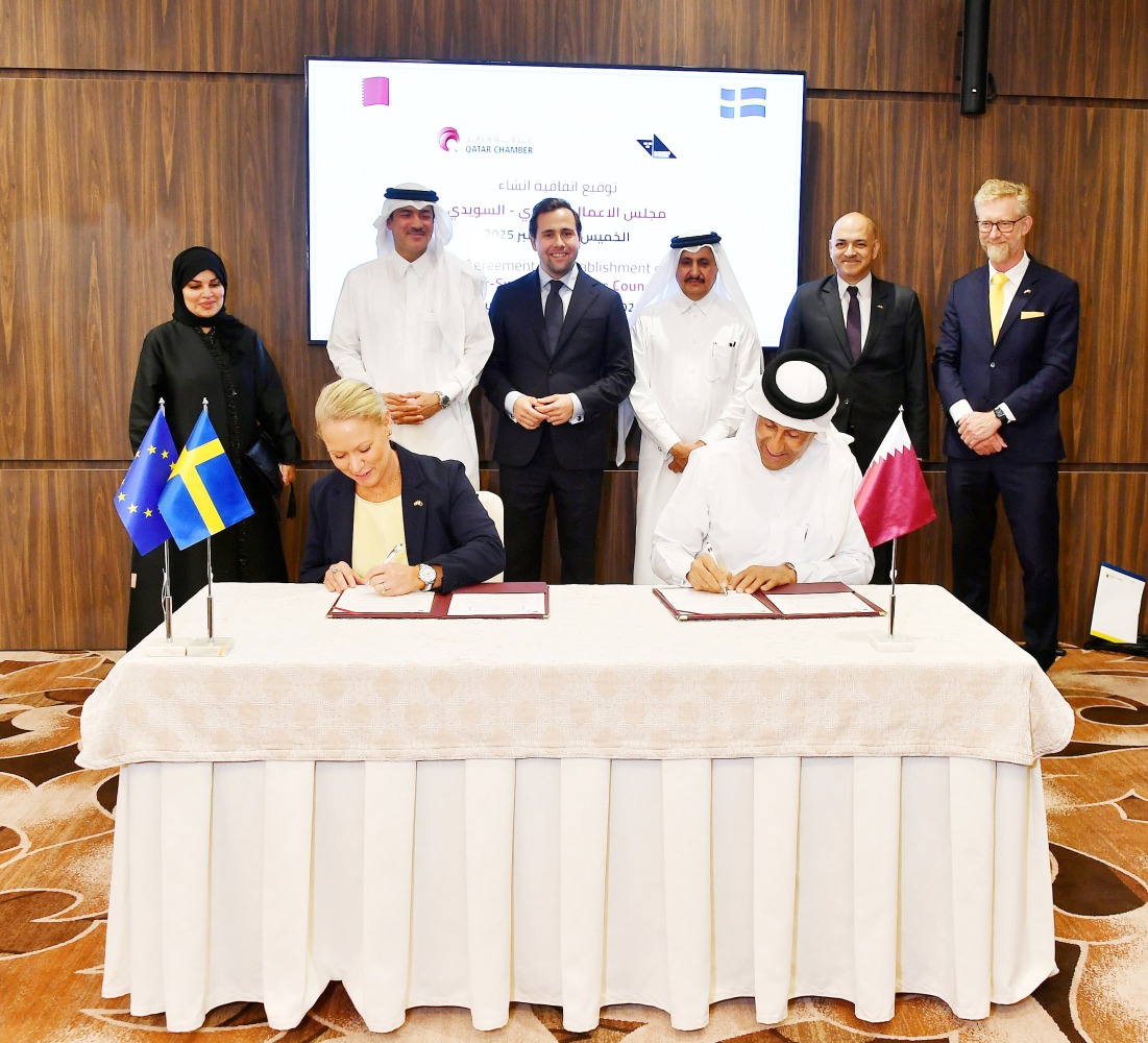 Minister of State for Foreign Trade Affairs at MoCI, H E Dr. Ahmed bin Mohamed Al-Sayed; Minister of International Development Cooperation and Foreign Trade of Sweden, H E Benjamin Dousa; Chairman of QC Sheikh Khalifa bin Jassim bin Mohamed Al Thani with other officials during the agreement signing.