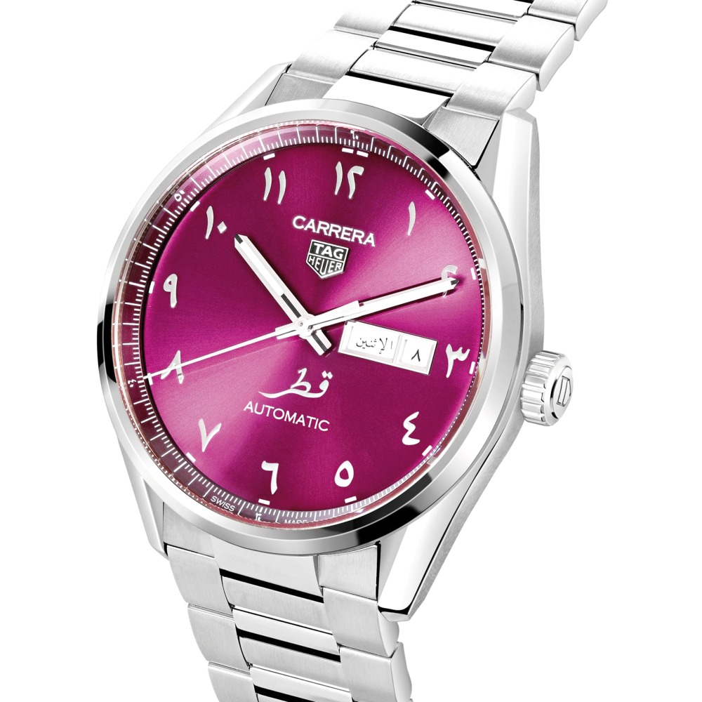 The new limited edition features a lively “Al Adam” (Maroon) dial inspired by the Qatari national flag color, with Arabic numeral applied indexes and “Qatar” in Arabic printed above 6 o’clock.
