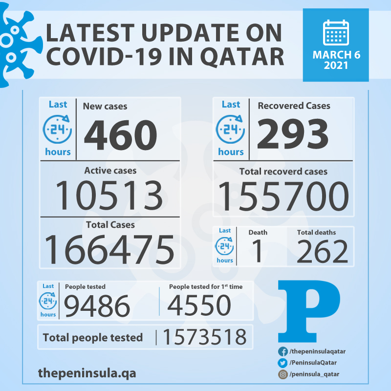 Doha: Ministry of Public Health (MoPH) today reported 460 new cases of coronavirus (Covid-19) and 293 people recovered from the virus in the last 24 hours, bringing the total number of people recovered in Qatar to 155,700.