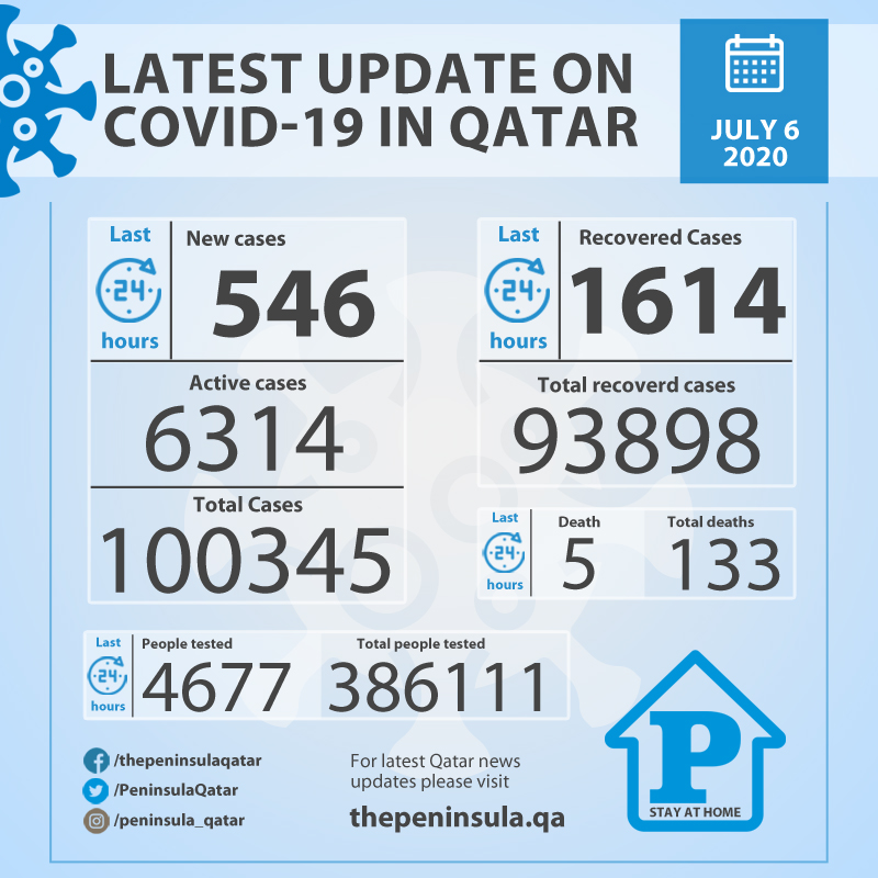 Qatar reports 546 COVID-19 cases and 5 deaths on July 6