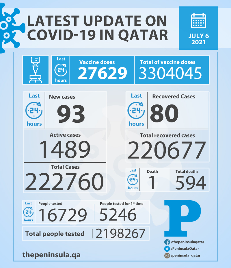 Doha: Ministry of Public Health (MoPH) today reported 93 new cases of coronavirus (Covid-19) and 80 people recovered from the virus in the last 24 hours, bringing the total number of people recovered in Qatar to 220,677.